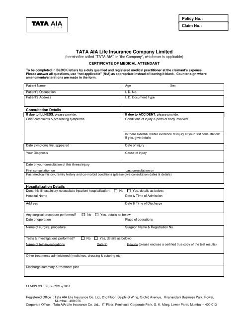 Part Ii Accident Hospitalisation Claim Form Tata Aia Life